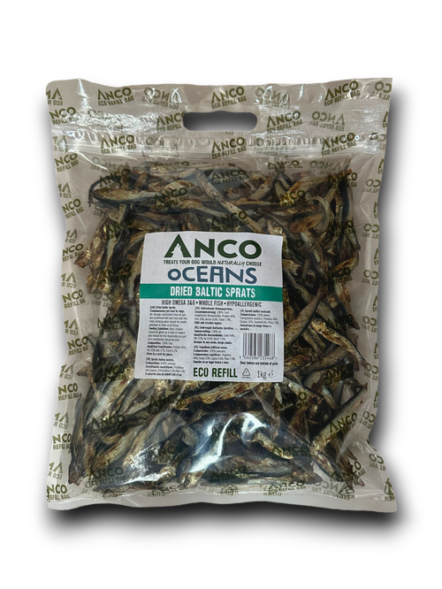 Anco Dried Sprats are really beneficial to your dog. These sprats are hypoallergenic meaning they are suitable to those with sensitive tummies. Naturally rich in Omega oils which are ideal for promoting healthy skin and coat, assists eye and brain development - helps increase intelligence and training ability - and even chewing down on the treat helps to remove tartar from their teeth! These treats have a natural enticing smell your dog will of course love, and they can feel good eating them. Highly digestible, reduces the work needed by your dog's digestive system, ideal for those with sensitivities. Packaged in our Eco bags, you can enjoy the cost savings as well as taking part in reducing packaging waste! Our Eco Bags are fully reusable and recyclable.